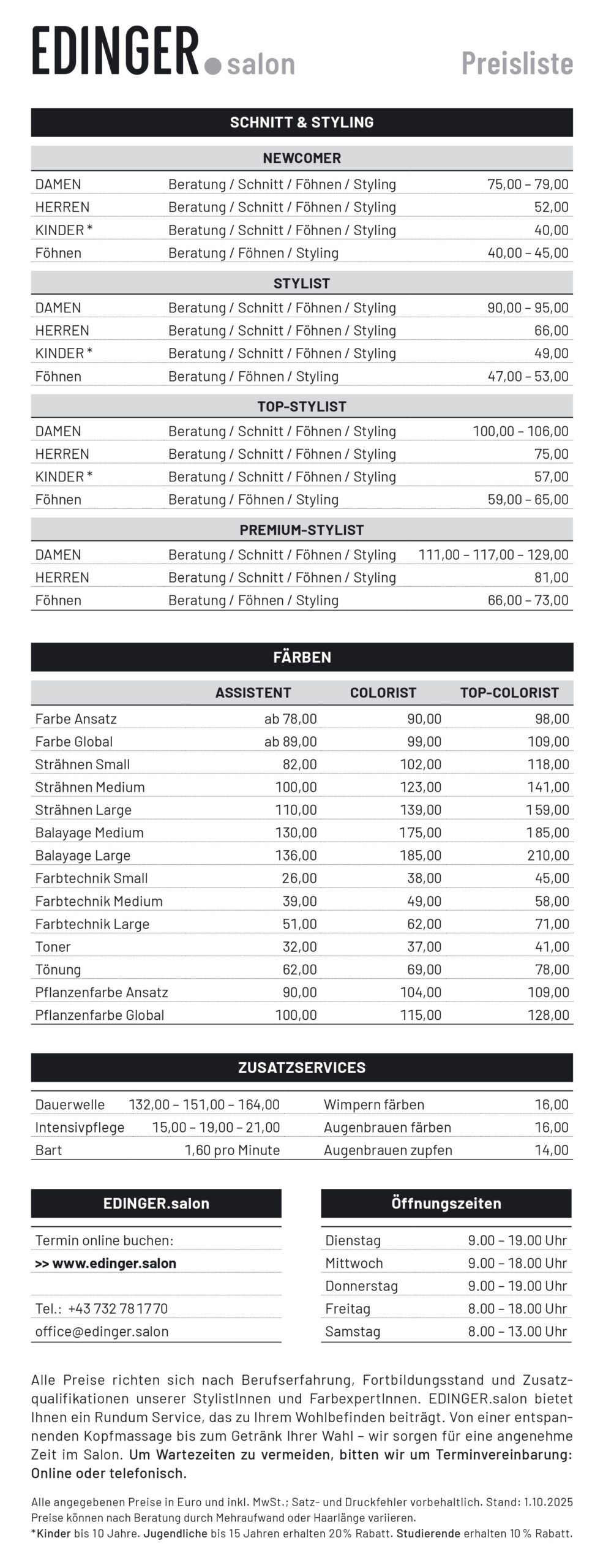 Wählen Sie selbst aus unserem Stylisten-Team zwischen Newcomer, Stylist, Top Stylist & Premium Stylist, sowie bei unserem Farb-Team zwischen Assistent, Colorist und Top Colorist. Je nach indivdueller Erfahrung und Ausbildung orientiert sich unsere Preisgestaltung.